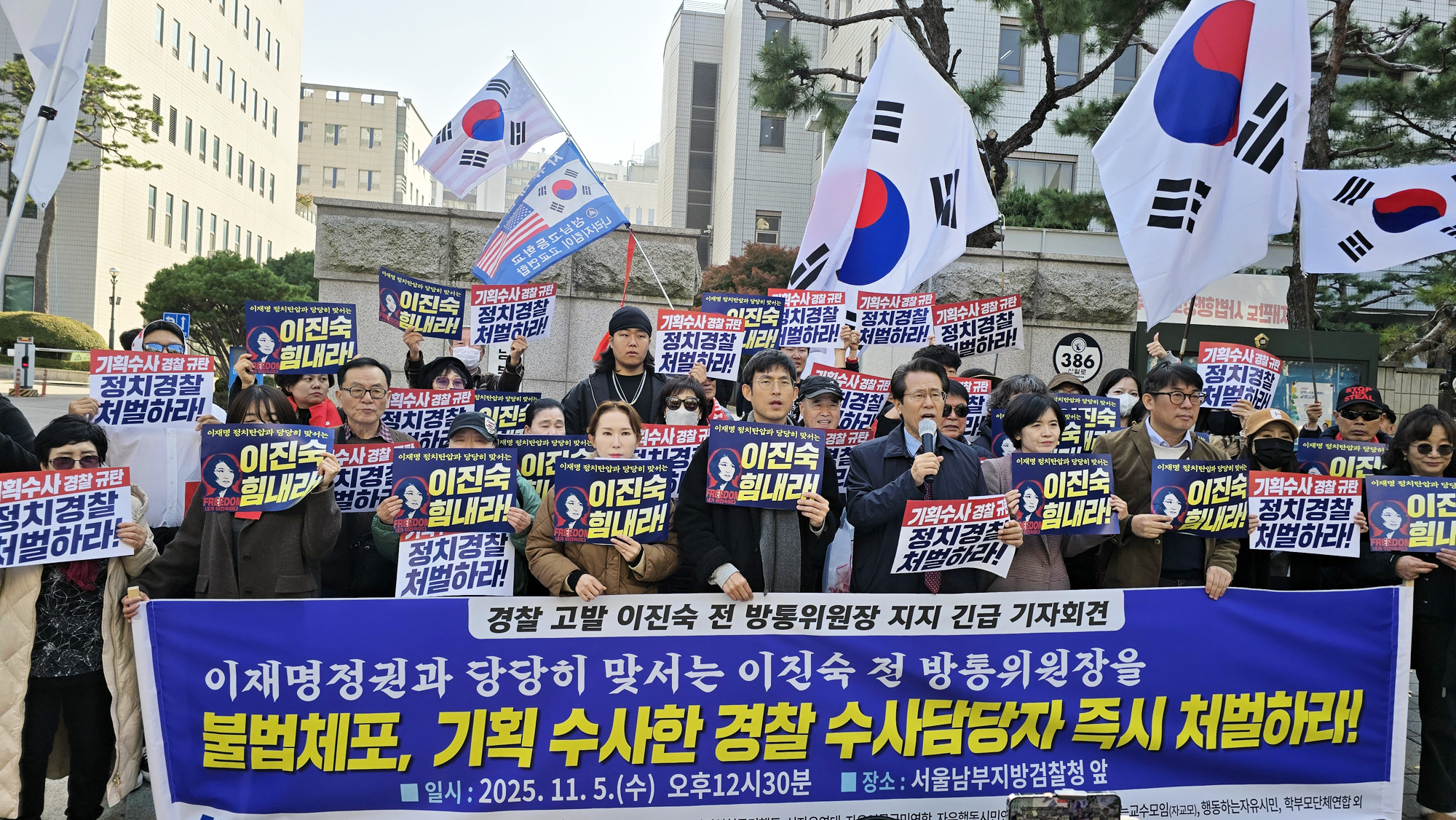 이들은 성명에서 “경찰이 이진숙 전 방통위원장을 선거기간이 아님에도 공직선거법 위반 혐의를 씌우고, 체포영장을 발부받아 수갑을 채운 채 영등포경찰서로 압송하던 장면은 세계 토픽감이었다”며 “이 사건으로 국민 대다수는 큰 충격을 받았고, 이재명 독재정권의 민낯이 백일하에 폭로되었다”고 했다.
