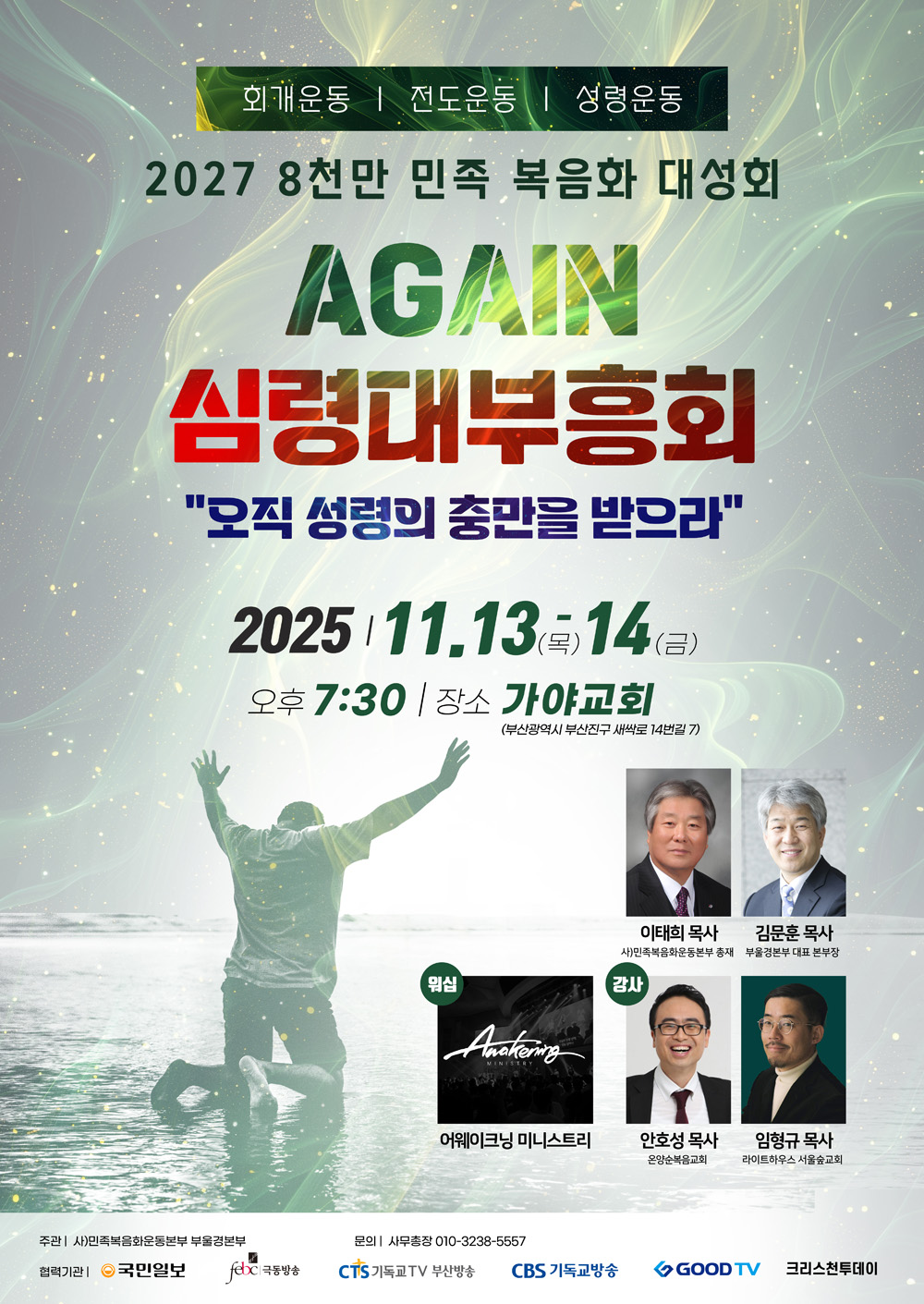 사단법인 민족복음화운동본부 부울경본부(대표본부장 김문훈 목사)가 오는 11월 13~14일 오후 7시 30분, 부산 가야교회(담임 박남규 목사)에서 ‘어게인 심령대부흥회’를 개최한다.