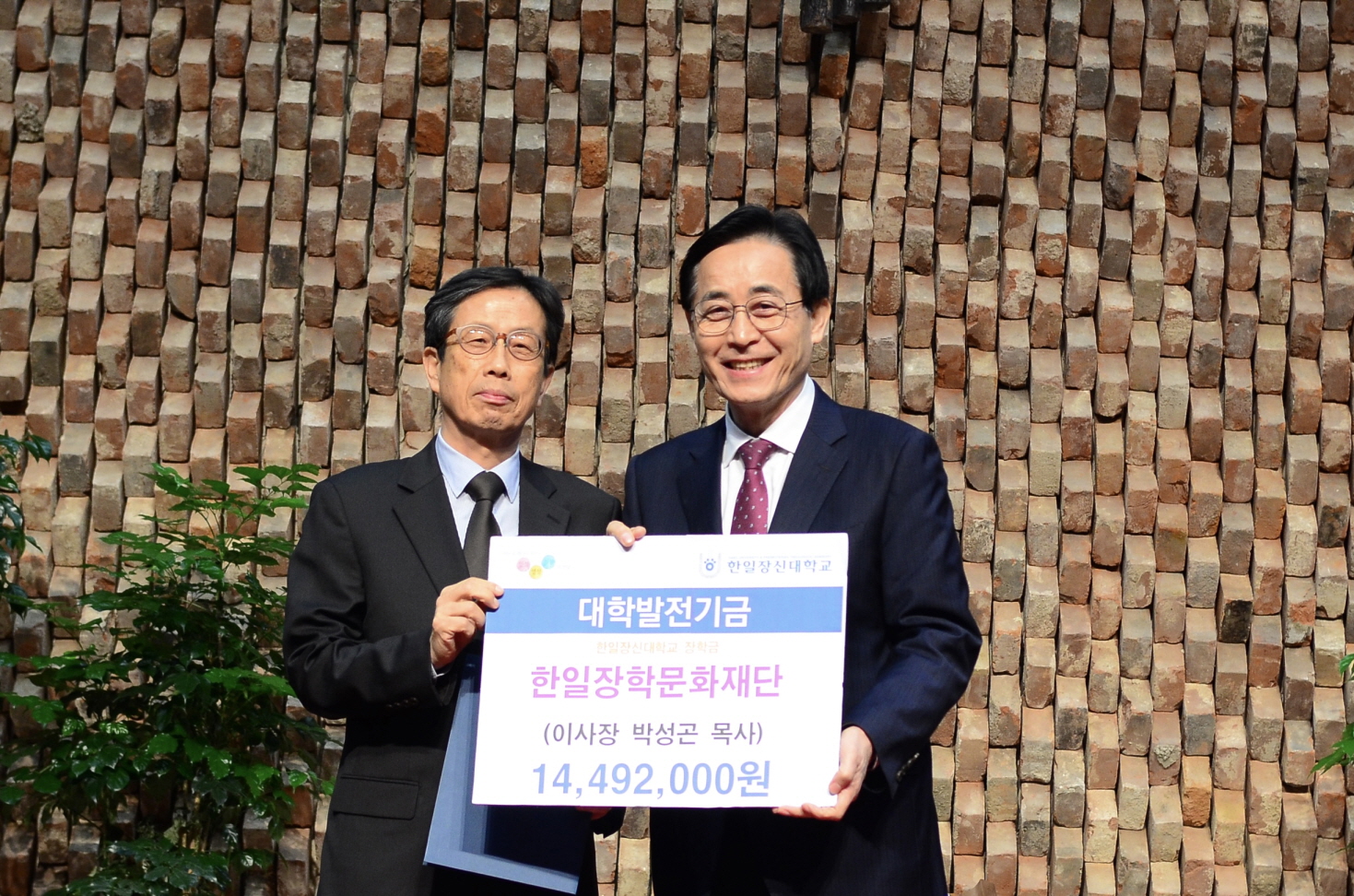 (재)한일장학문화재단 박성곤 이사장이 황세형 총장에게 기탁금을 전달했다. ©한일장신대 제공