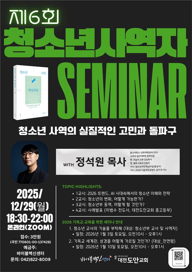강의는 청소년사역 15년 경력의 정석원 목사가 맡는다. 이번 세미나는 2026년을 대비한 청소년 트렌드를 분석하고, AI 시대 속에서 변화하는 청소년의 신앙과 정서를 이해하는 내용을 중심으로 진행된다.