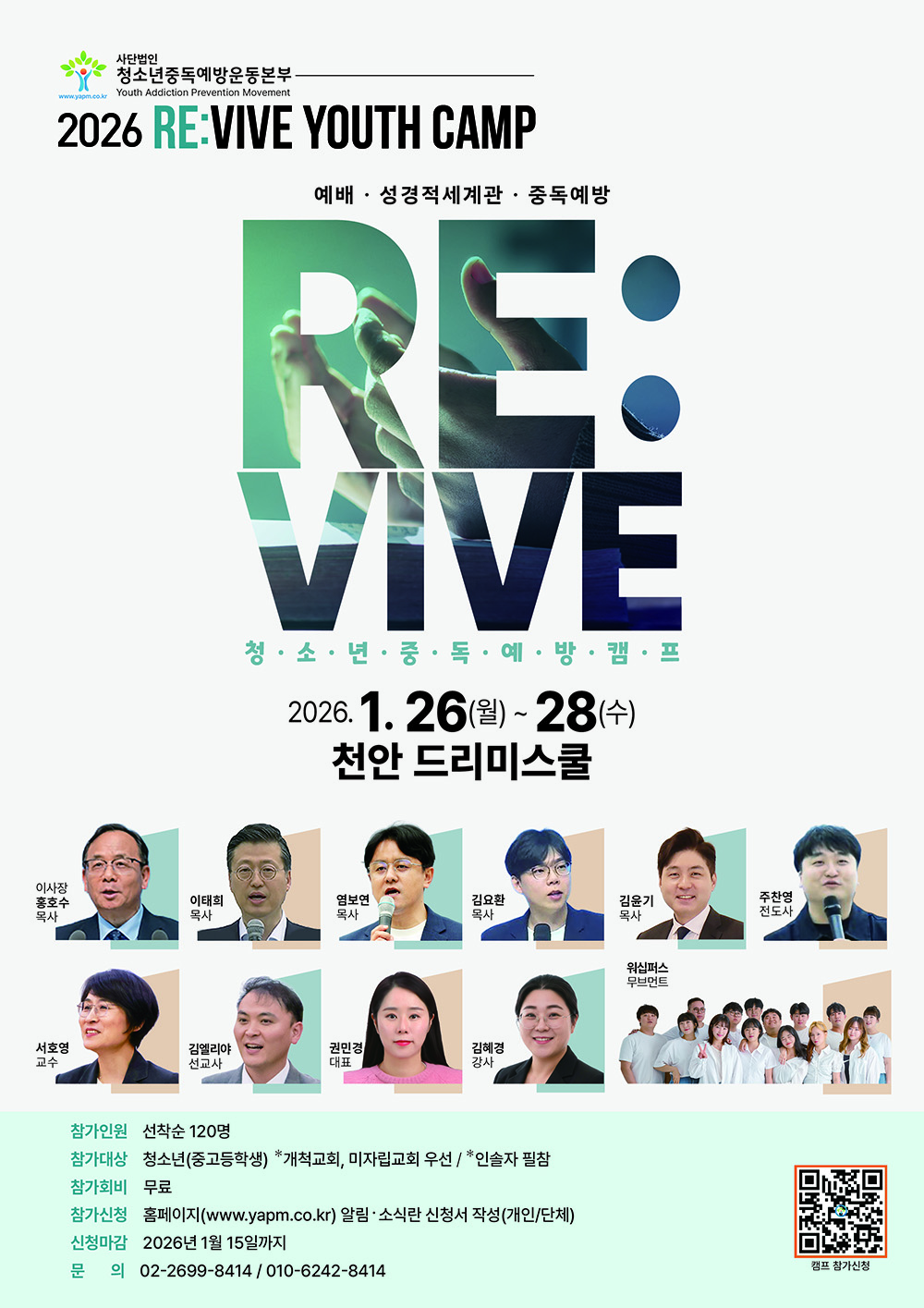 먼저 1월 26일부터 28일까지 천안 드리미스쿨에서 ‘리바이브(RE:VIVE) 청소년 중독예방 캠프’를 진행한다. 청예본 이사장인 홍호수 목사를 비롯해 이태희 목사, 염보연 목사, 김요환 목사, 김윤기 목사, 주찬영 전도사, 서호영 교수, 김엘리야 선교사, 권민경 대표, 김혜경 강사가 참여한다.