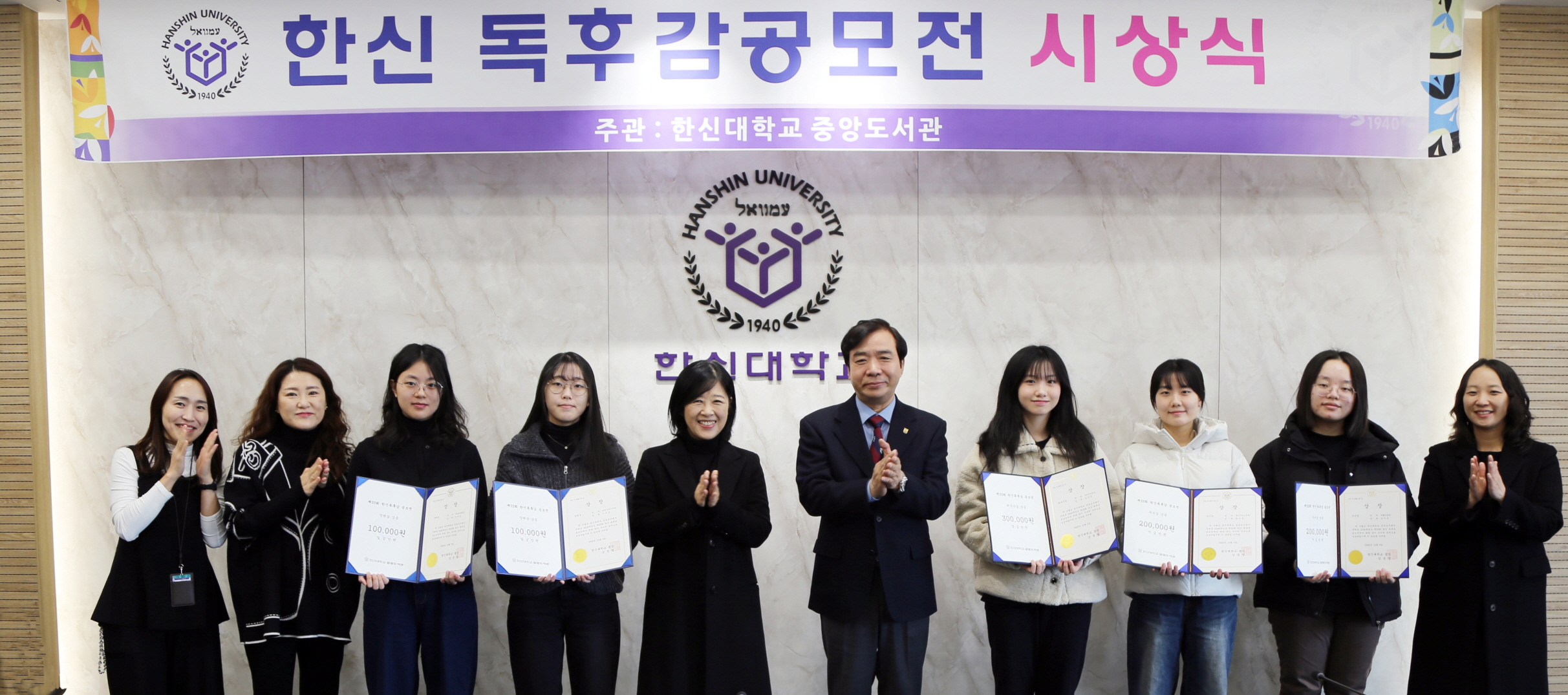 한신대학교(총장 강성영) 중앙도서관(관장 강영경)은 3일 오전 경기캠퍼스 장공 대회의실에서 ‘제33회 한신 독후감 공모전 시상식’을 열고 최우수상, 우수상, 장려상 수상자를 발표했다.