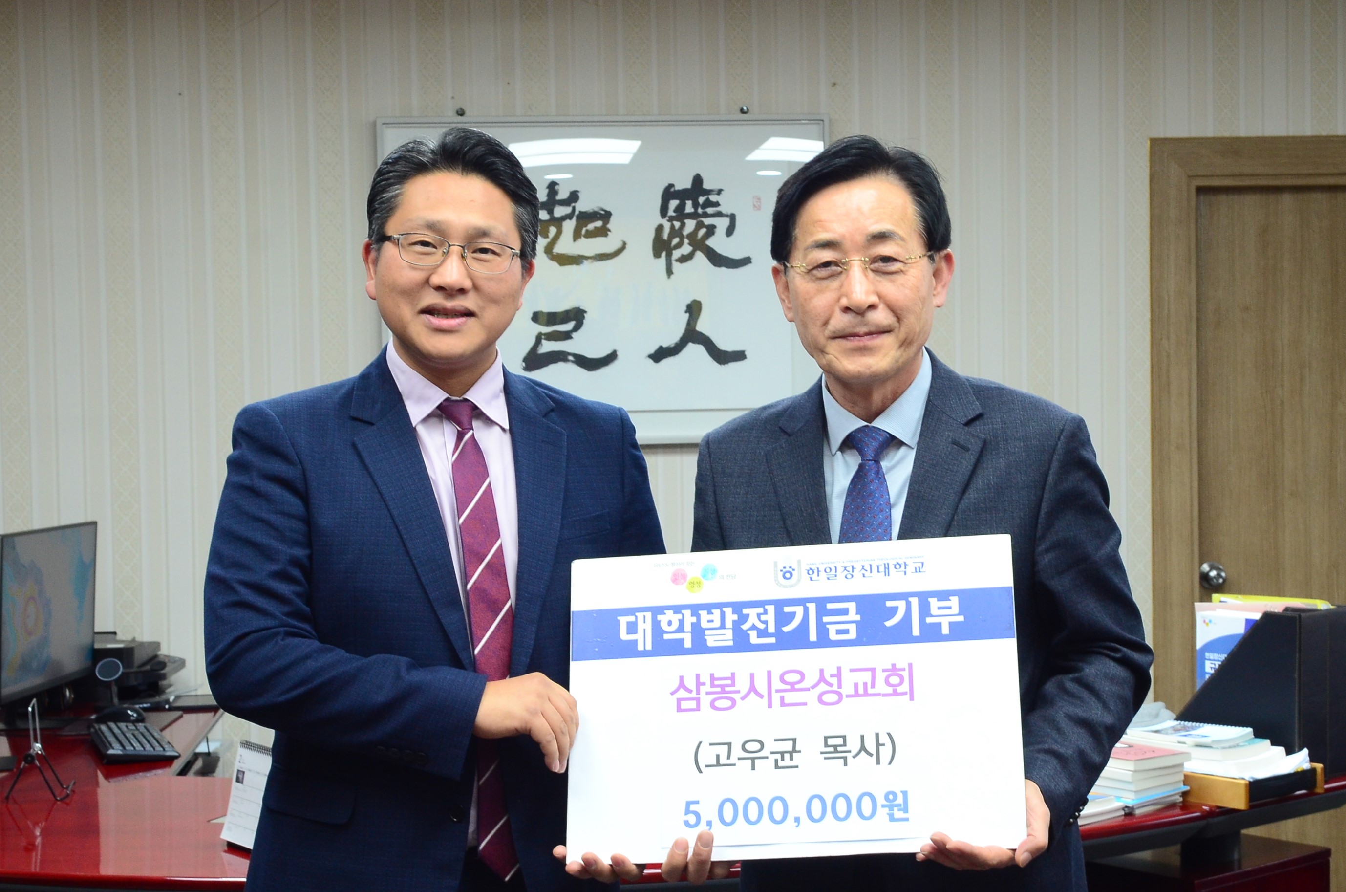 삼봉시온성교회가 한일장신대학교의 교육 사역과 인재 양성을 지원하기 위해 발전기금 500만 원을 기부했다. ©한일장신대 제공