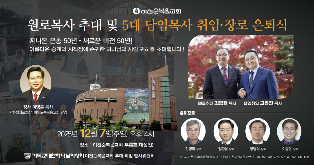 이번 예식은 이천순복음교회의 50년 역사 속에 함께하신 하나님의 은혜를 기념하고, 새로운 세대의 영적 리더십을 세우는 자리다.
