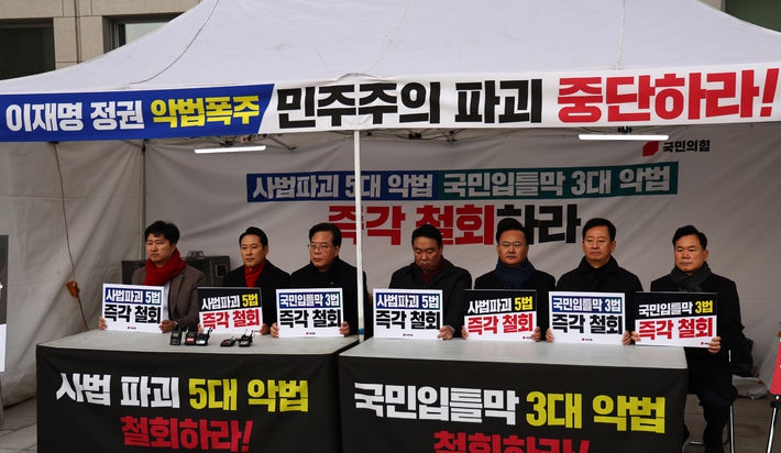 송언석 원내대표도 법안 추진을 강하게 비판했다. 송 원내대표는 “대법원을 장악하고 판사 독립을 훼손하는 사법파괴 5대 악법과 유튜버 언론 자유를 제한하는 입틀막 3대 악법은 전체주의로 가는 길”이라고 주장하며 “국민의힘 의원 107명 전원이 국회 안팎에서 총력 투쟁하겠다”고 밝혔다.