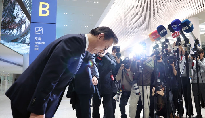 통일교로부터 금품을 수수했다는 의혹이 제기된 전재수 해양수산부 장관이 11일 오전 인천국제공항 제2여객터미널을 통해 귀국해 의혹 관련 입장을 밝힌 뒤 인사하고 있다. ©뉴시스