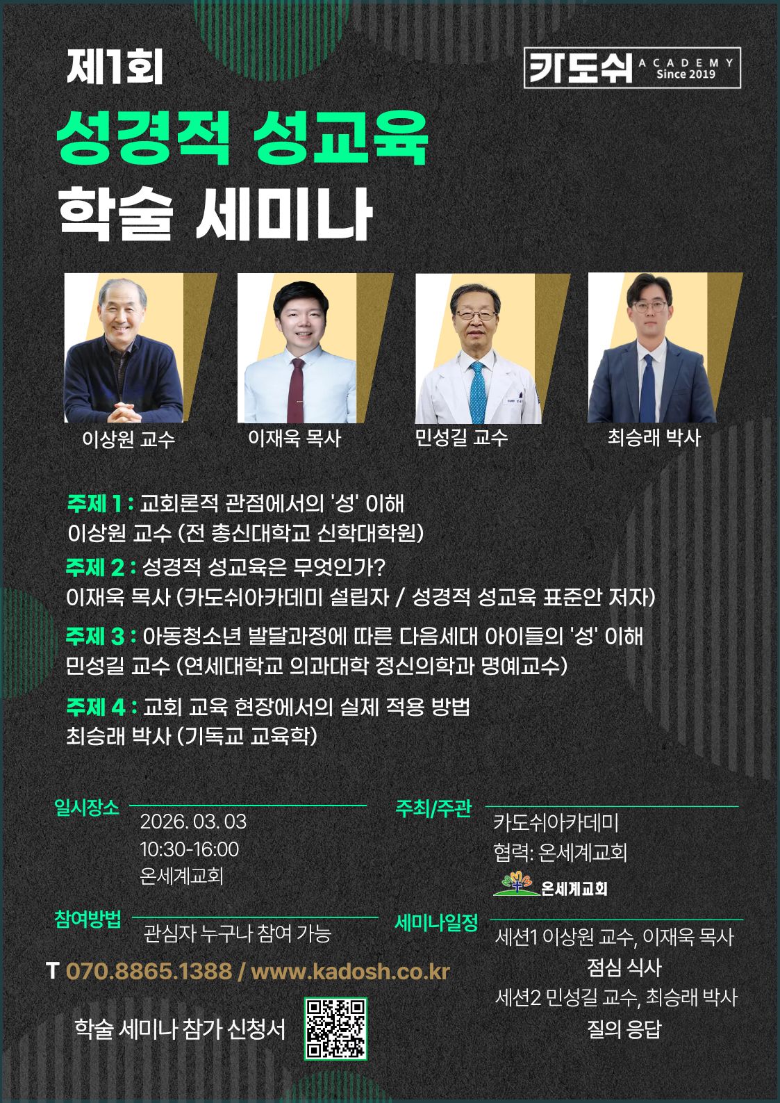 카도쉬아카데미는 오는 3월 3일, 온세계교회에서 ‘제1회 성경적 성교육 학술 세미나’를 개최한다고 밝혔다. 이번 세미나는 성교육을 단순한 캠페인이나 일회성 강연이 아닌, 교회 교육의 책임과 방향을 학문적으로 논의하는 자리로 기획됐다.