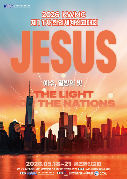 전 세계 한인 선교사와 목회자, 평신도 지도자들이 모여 선교 비전과 전략을 나누는 축제의 장인 2026 제11차 한인세계선교대회가 오는 5월 18일부터 21일까지 뉴욕 퀸즈한인교회(김바나바 목사)에서 개최된다.
