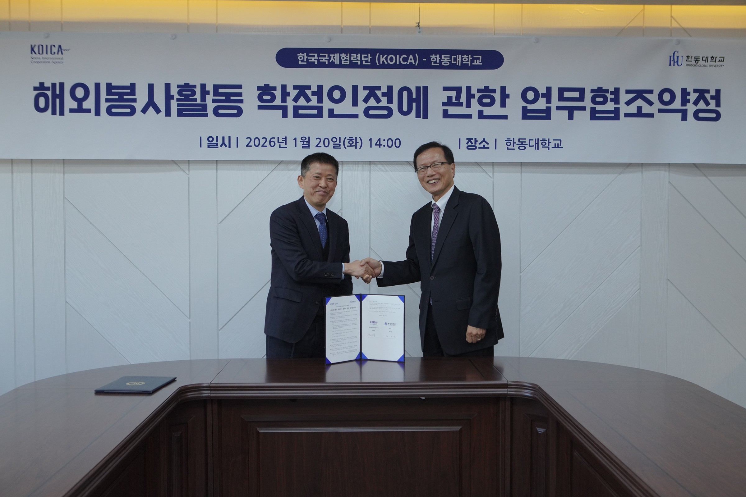 한동대학교(총장 최도성)는 지난 20일 한국국제협력단(KOICA)과 해외봉사활동 학점인정 협력에 관한 업무협약을 체결했다고 최근 밝혔다. 이번 협약을 통해 학생들이 해외 현장에서 수행한 봉사 활동이 학점으로 인정돼, 정규 교육과정 내에서 국제개발협력 경험을 쌓을 수 있게 됐다.