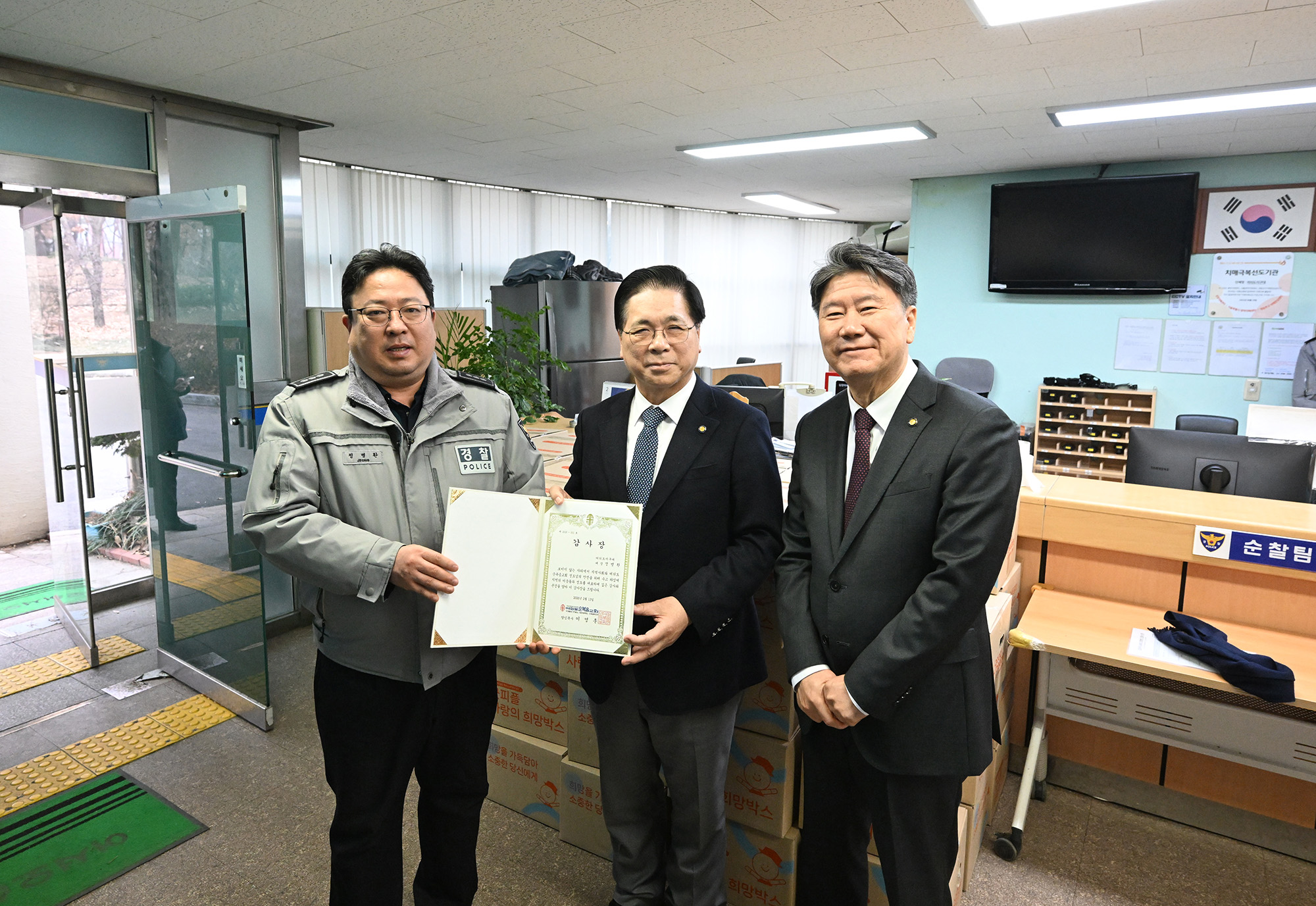 이날 이 목사는 경찰관들에게 감사장과 감사패를 전달하고, 떡국 떡과 김, 식용유 등 명절 식품으로 구성된 ‘희망박스’를 기탁했다. 그는 “보이지 않는 곳에서 지역 사회의 치안과 시민의 안전을 위해 헌신해 주신 데 깊이 감사드린다”며 “여러분의 노고 덕분에 시민들이 평안한 명절을 보낼 수 있다”고 말했다.