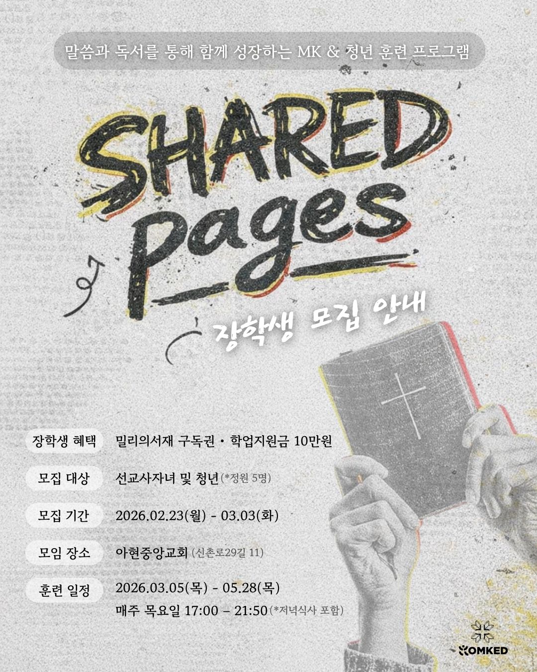 한국선교사자녀교육개발원(KOMKED)가 2월 23일부터 3월 3일까지 선교사 자녀(MK) 및 청년을 대상으로 말씀과 독서를 통해 성장하는 MK 청년 훈련 프로그램 ‘Shared Pages’ 장학생을 모집한다.