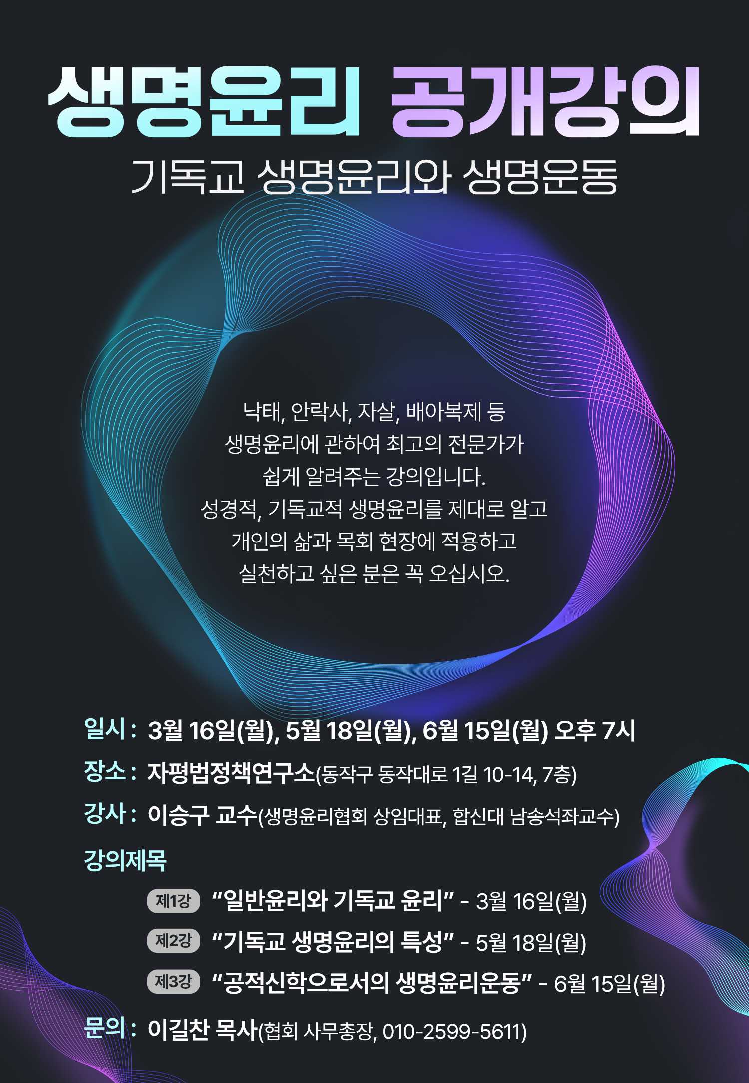 한국기독교생명윤리협회는 생명윤리에 대한 이해를 넓히고 기독교적 생명운동을 사회적으로 확산하기 위해 ‘생명윤리 공개강의’를 진행한다고 밝혔다.