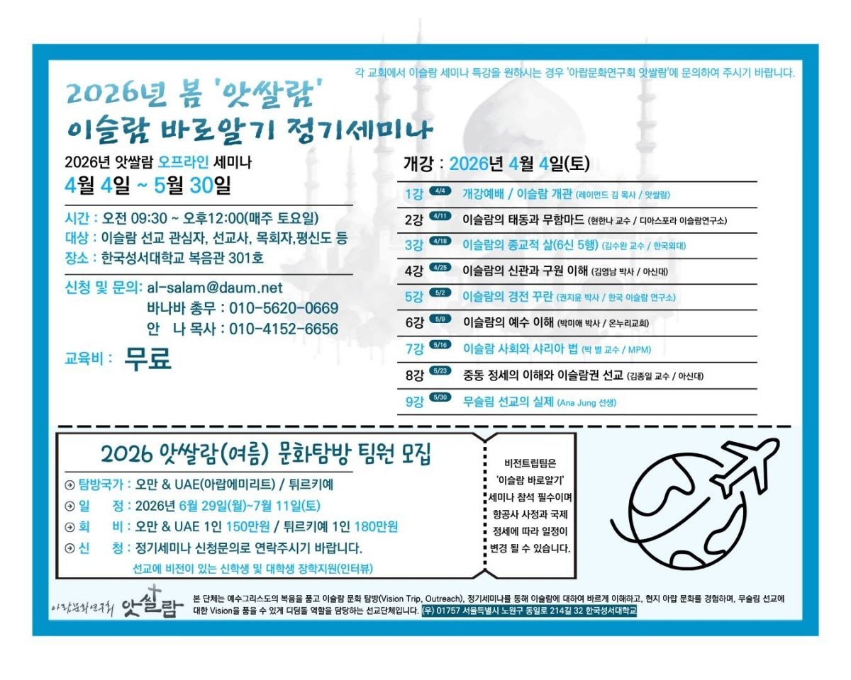 아랍문화연구회 앗쌀람이 이슬람에 대한 이해를 돕는 정기 교육 프로그램을 마련한다. 앗쌀람은 오는 4월 4일부터 5월 30일까지 서울 노원구 한국성서대학교 복음관에서 ‘2026년 봄 이슬람 바로알기 세미나’를 진행한다고 밝혔다.