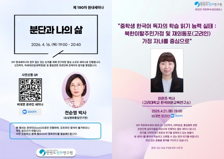 한반도평화연구원(KPI)이 4월 원내세미나와 학문후속세대 세미나를 열고 신진학자와 대학원생, 통일 관련 단체 관계자들을 초청한다.