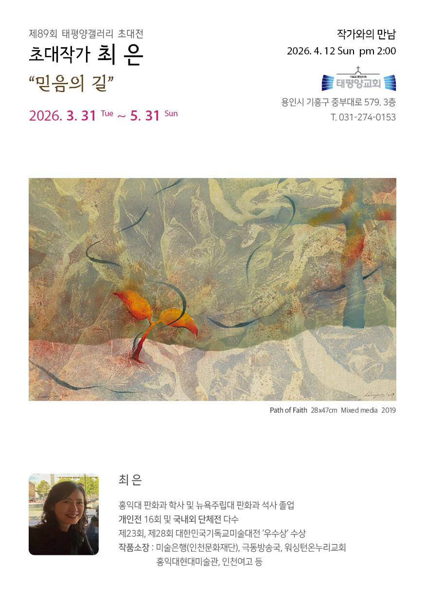 태평양교회는 지난 3월 31일부터 5월 31일까지 교회 내 태평양갤러리에서 제89회 초대전으로 작가 최은의 개인전을 진행한다고 밝혔다. 이번 전시는 ‘믿음의 길’을 주제로, 신앙의 여정을 예술적으로 풀어낸 작품들을 선보인다.