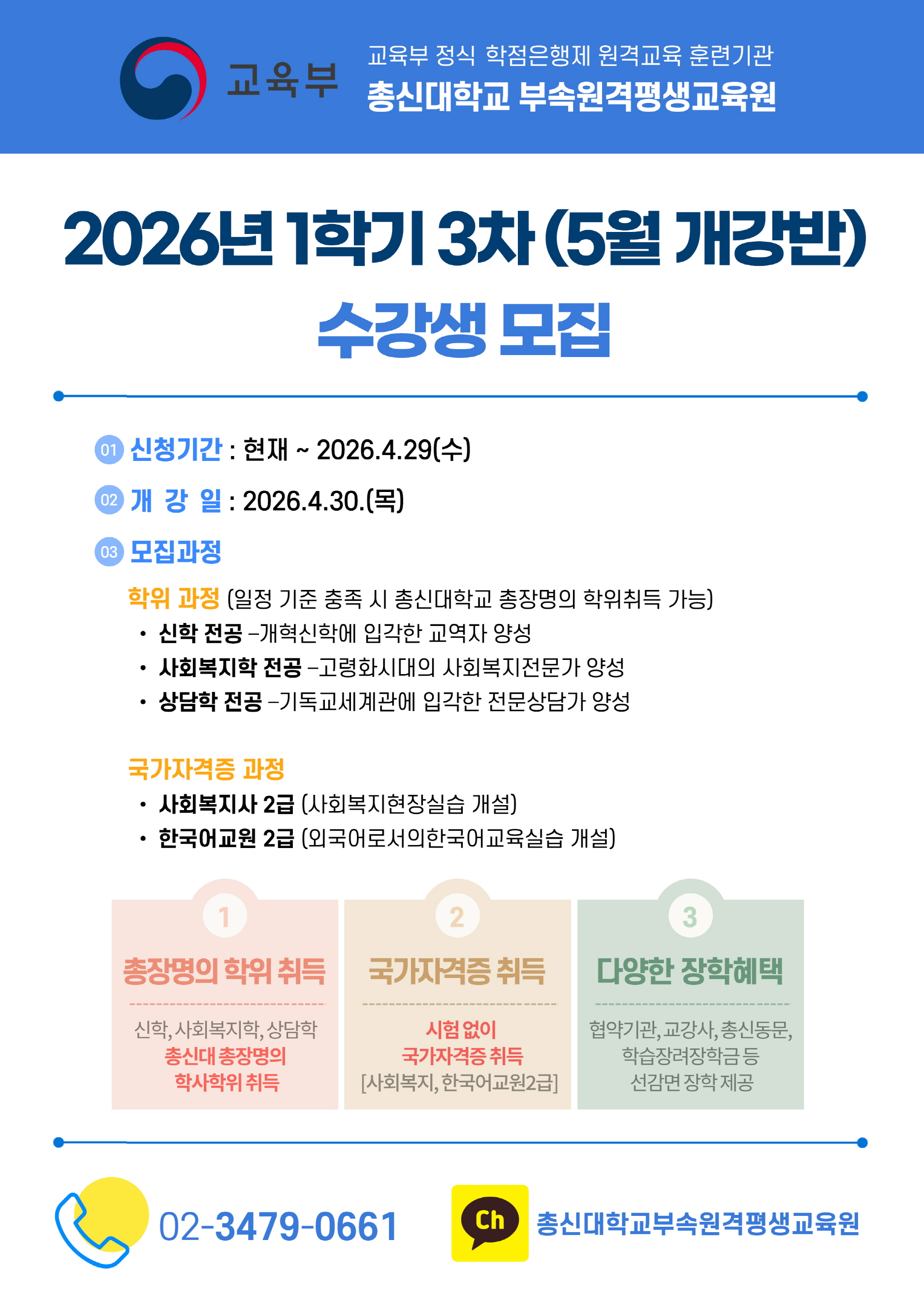 총신대학교 부속 원격평생교육원(원장 방은영, 이하 원격평교원)이 오는 4월 30일 개강하는 온라인 신학 학위과정 1학기 3차 수강생을 모집한다. 지원 자격은 고등학교 졸업 이상으로, 누구나 신청 가능하며 접수 마감은 4월 29일까지다.