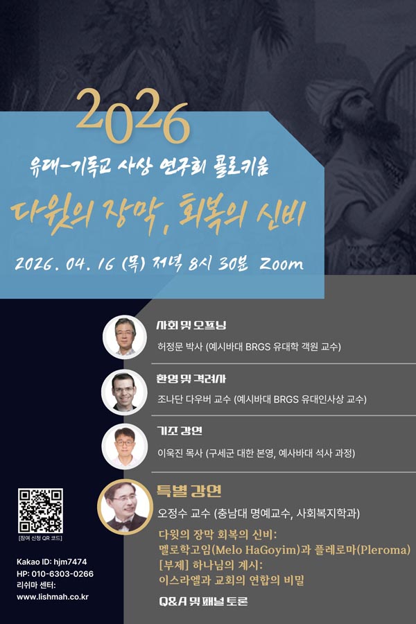 이번 유대-기독교 콜로키움에서는 오정수 충남대학교 명예교수가 특별 강연자로 나선다. 강연 주제는 ‘다윗의 장막 회복의 신비: 멜로학고임과 플레로마’로, 이스라엘과 이방 교회의 관계를 중심으로 회복과 연합의 신학적 의미를 조명할 예정이다.