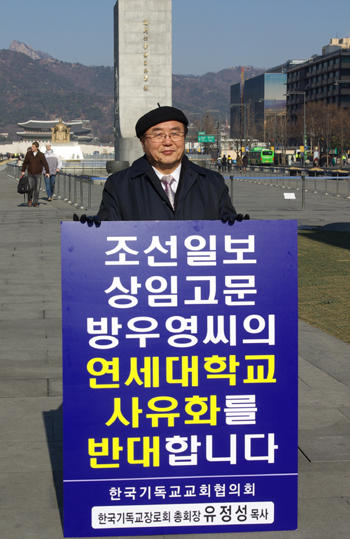 | ▲한국기독교장로회 유정성 총회장이 연세대 사유화 저지를 위한 1인 시위에 참여하고 있다. |